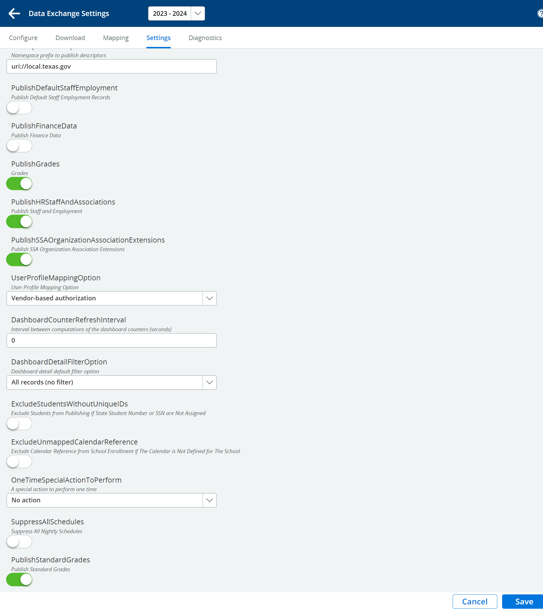 ExcludeUnmappedCalendarReference: For PowerSchool SIS profile only. Set ON at the start of the school year to skip calendar reference in Student Enrollments before TEA calendar mapping is completed. Set OFF when mapping is completed.