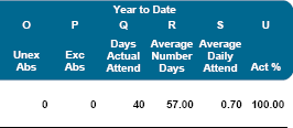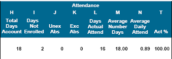 T—Act % | Actual Attendance divided by (Total Days Account minus Days Not Enrolled) [L/H-I]. |
