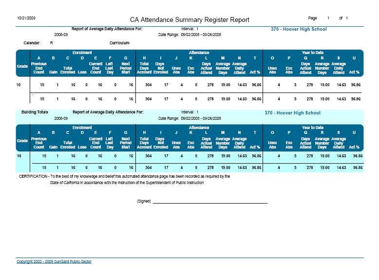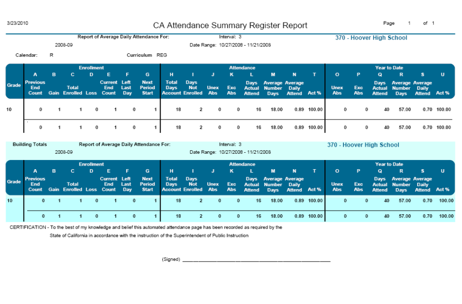 The CA Attendance Summary Register will be broken in to three sections for this discussion: Enrollment, Attendance, and Year to Date. Data in each section will be described below.