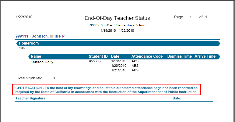 This report has been modified for California to include the appropriate Certification wording for electronic signature requirements from the State. This wording prints on the report when the Include Signature checkbox is checked.