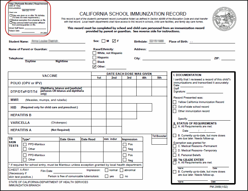 The California School Immunization Record prints the student's immunization and vaccination details based on the information you entered in the Immunizations page and Immunization Validation page. You can use the California School Immunization Record (Blue Card) page to filter and sort the immunization information the way you want it to be displayed it in the record.