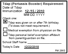 The Tdap section of the report for a student is updated as shown in the image below only when you enter and save the TDAP vaccination details by using the Immunizations page. For more information, refer to the TDAP File Mapping section.