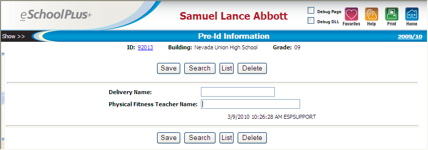 First, you will need a district-defined page to hold the teacher name. In our example, we created a page called Pre-Id Information and added two fields to it: Delivery Name and Physical Fitness Teacher Name.