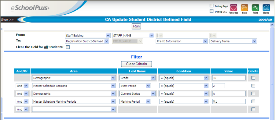 Alternatively, if you were updating the Delivery Name field on the Pre-ID Information page (or whatever your district has called the page) and you are administering the test during second period to all active 10th graders in Marking Period 1, your page might look like this: