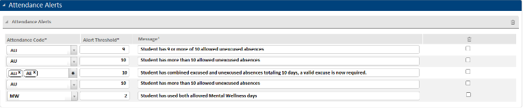 The dialog displays are applicable for CT customers only when choosing an attendance code for a student. If the student meets a threshold set on the Attendance Alerts page for that code, you will receive an Attendance Alert Dialog for acknowledgement. The attendance code being entered on the page will be included in the threshold count.