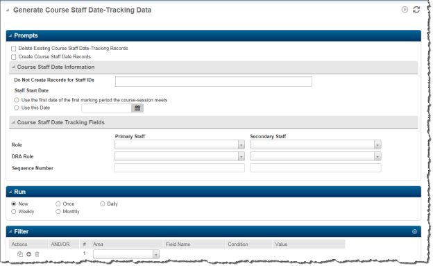 | Create Course Staff Date Records | If checked, Course Staff Date records will be created for primary and secondary staff members. If Course Staff Date records already exist for a course-session, the utility will skip that course-session. |