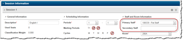 - Click Save. The primary staff member is now assigned for the session. You do NOT need to re-save the Master Schedule course section on the Master Schedule Course Information page.