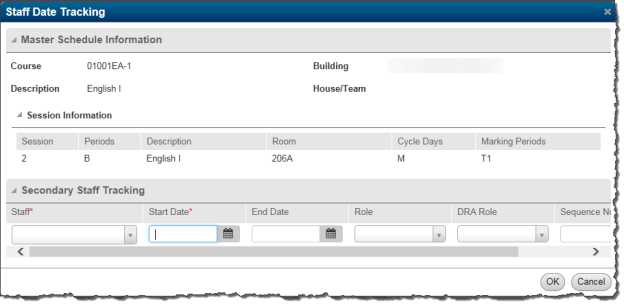 - In the Master Schedule Session Information section, click the hyperlink in the Primary Staff field to assign a primary staff member to the course-section session. The Staff Date Tracking pages opens: