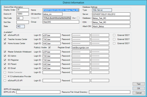 Note: You may click Test before you click OK to verify that you entered the database and the login information properly. If you do not explicitly click Test, the system will perform the Test when you click OK.