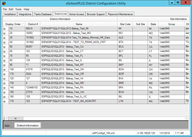 button for the district information you want to edit.You can edit any of the following fields directly in the grid: Display Order, Site Code, Sub Site, State, DB Identifier, and DSN.