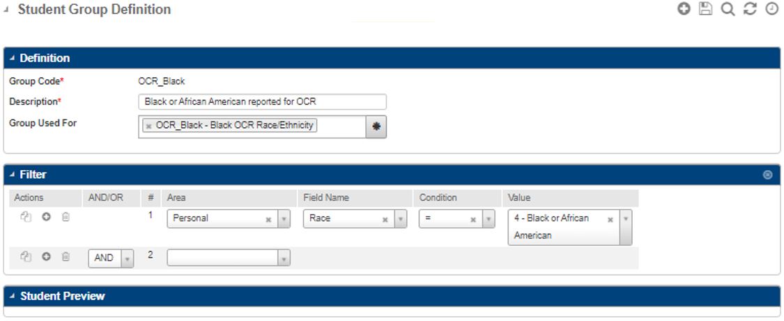 ) button. This will take you to the Student Group Definition page where you can add a new group and search criteria. Note that the Group Code field will not allow special characters, such as ? % & * | or a space.Race/Ethnicity OCR groups do not need to include criteria to omit other races/ethnicities.