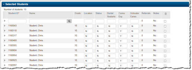 Use this page to update dental exam data for several students at one time. You will enter default values for the data associated with the dental exam and make changes to the exceptions as necessary.
