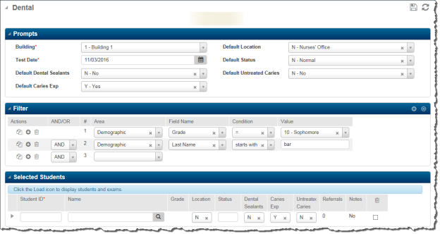 - Select the group of students you wish to enter Dental Exam data for in the Mass Load Filter section of the paged. After you enter your selection criteria, click the Load button.