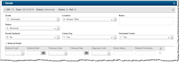 | Untreated Caries | Indicates whether student has untreated caries (cavities). Choices are Yes, No or Unknown. Enter Referral information under the Referral Detail section to update additional information needed for the IL Dental Conservation Report. The Diagnosis Code field has been added for Illinois on this page. For Dental Exams there are no prescribed Diagnosis Codes from the State—you may enter values in this field if you want, but do not have to. The other fields work as they did before, although there are specific State Equivalency Codes that must be used for Followup Codes. |