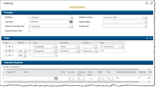 Use this page to update hearing exam data for several students at one time. You will enter default values for the data associated with the hearing exam and make changes to the exceptions as necessary.