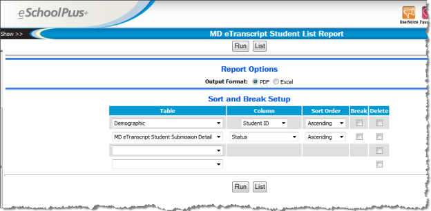 You can choose to have the report generate as a PDF or Excel file. Select the tables and columns if you would like the report sorted a specific way. For example, the above selections will sort the records by Student ID, and then by the Status of the records. Once you have the settings adjusted, click Run to generate the report.
