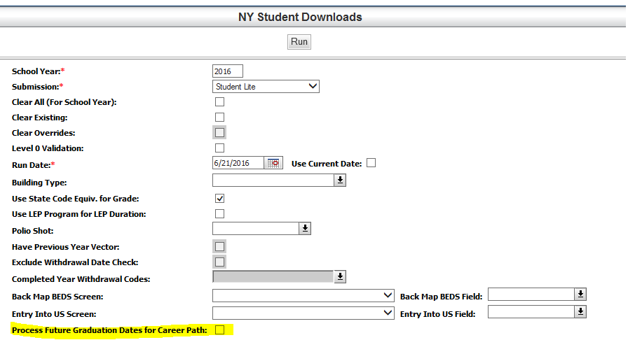 – In addition we have added a new prompt, "Process Future Graduation Date for Career Path", to the NY Student Downloads. This prompt will only be used for the Student Lite submission.