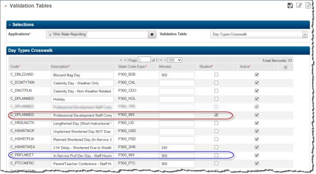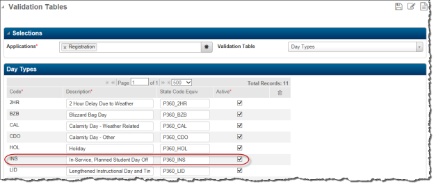 In this example, the district has created a single Day Type code 'INS' with the State Code Equiv 'P360_INS' to designate a teacher In-Service day where the students have a planned day off from school. This Day Type code will be used for the Day Type field on the Calendar Day Detail panel.Verify the Day Type Crosswalk codes.