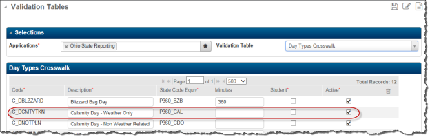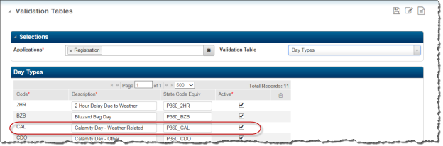 In this example, the district has created the Day Type 'CAL' with the State Code Equiv of 'P360_CAL' to be used for Calamity Days that are weather related. This Day Type code will be used for the Day Type field on the Calendar Day Detail panel.Verify the Day Type Crosswalk code.