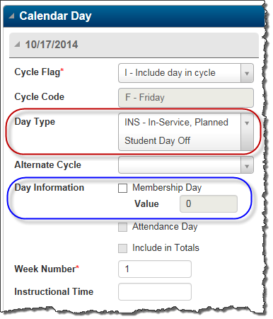 This table determines what DN record is created at the Calendar download. In this example, the district has linked the 'P360_INS' State Code Equiv to 2 different DN records, 'C_DPLANNED' and 'C_PRFLMEET'. The Minutes column is left blank for the 'C_DPLANNED' record. The students missed an entire day, so zero minutes is recorded for the day. For the 'C_PRFLMEET' record, the teachers met for the full day, so enter 360 for the Minutes field. Note: Normally you would not need to enter data in the Minutes field if the amount is the same as the default instruction time, but in this case the Membership Day checkbox on the Calendar Day Detail page (as seen below) must be unchecked in order to report zero minutes for the student planned day off. Hours must still be reported for the teachers for the 'C_PRFLMEET' DN record. so you must enter the minutes for the teacher DN record.|Once you have determined the correct Day Type code, enter the data on the Calendar Day Detail page.