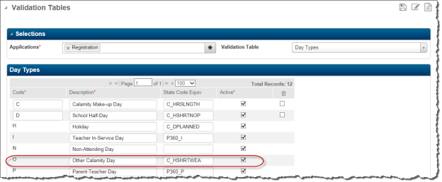 In this example, the district has created the Day Type Code 'O' with the State Code Equiv of 'C_HSHRTWEA' to be used for Calamity Days where the school day is interrupted by weather. This Day Type code will be used for the Day Type field on the Calendar Day Detail panel.Once you have determined the correct Day Type code, enter the data on the Calendar Detail Day page.