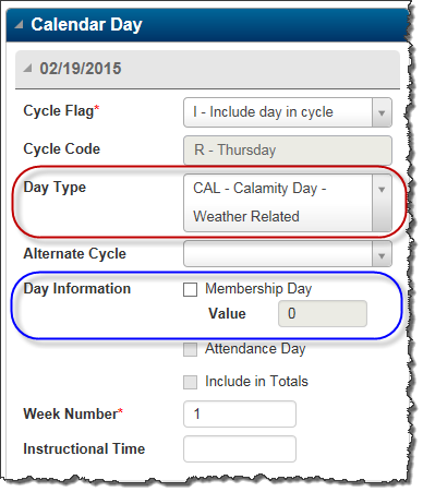 For the Day Type field, enter the code that will be used for the calamity day. In this example, the Day Type code 'CAL' is used to report a snow day. You will also need to uncheck the Membership Day checkbox since the students did not report to school. If this box is left checked, the Default Instruction Time from the Calendars page will be reported for this day. Note:You CANNOT enter zero minutes in the Instructional Time field. If you enter zero minutes, the system will give you an error that zero is not a valid entry. When you need to report zero instructional time for a day, uncheck the Membership Day checkbox.|Once you have verified the correct information has been entered, click Save.