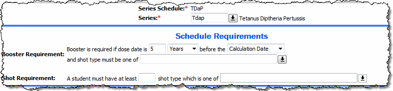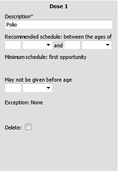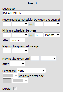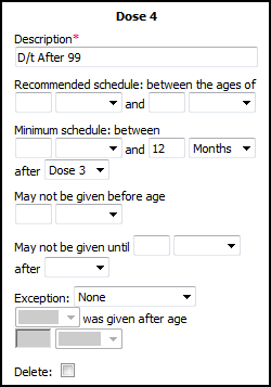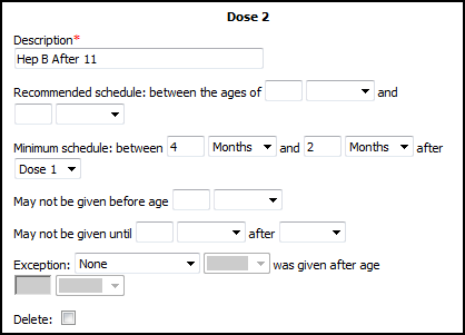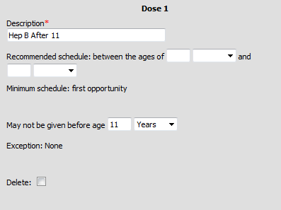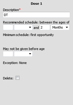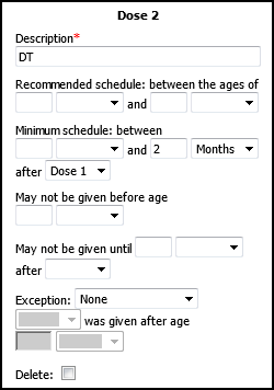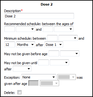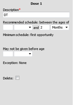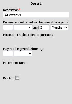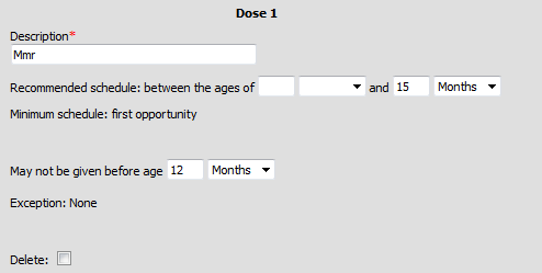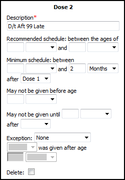 The Dose 2 Description needs to read as Measles – 24 days. This tells the Immunization Validation and student-level Recalculation to calculate Dose 2 using a minimum schedule starting at 24 days after Dose 1.