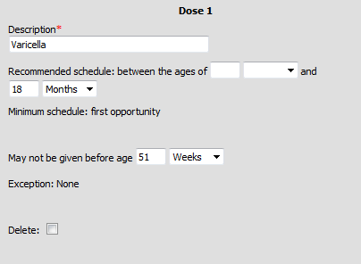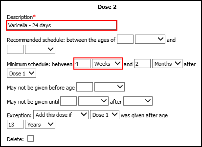 The Dose 2 Description needs to read as Varicella – 24 days. This tells the Immunization Validation and student-level Recalculation to calculate Dose 2 using a minimum schedule starting at 24 days after Dose 1.