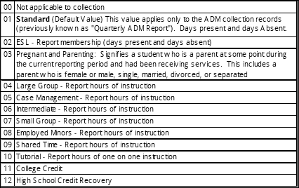 The student should be reported with zero days present/days absent and zero hours of instruction with their actual start date and end date for the collection period. TheADM EndDt Code, ADMDiplomaTypeCode,ADmWithFactorCode should be reported as 00. For this program, an Enrollment Program Type Code of 13 is reported. |
