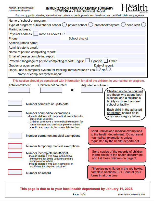 If your school/facility does not have any children who are incomplete, insufficient, no record or have a medical exemption needing review, you do not need to complete page 2. You still need to complete pages 3 and 4, and can send these pages in with page 1.