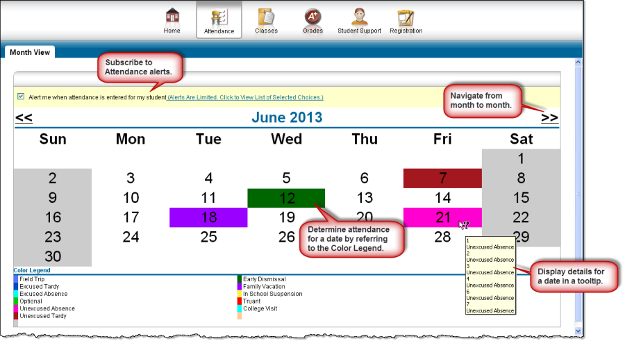 To view details for a date when your student was absent or tardy, move your pointer over the day. A tooltip displays the type of attendance entered by the office or teacher for the periods affected.