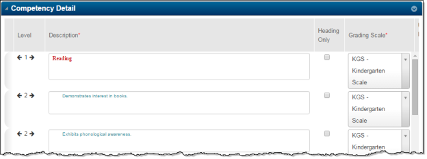 In addition to providing the ability to calculate a mark for an individual competency, eSchoolPlus supports the ability to calculate a mark for an overall competency based on assignments defined for the sub-competencies associated with it. For example, you can calculate a student's Reading mark based on the student's performance for several Reading sub-competencies. To calculate a mark for an overall competency, there must be competencies indented below it in the Competency Setup. The image below illustrates a Reading competency with competencies indented below it; an overall average can be calculated for Reading.