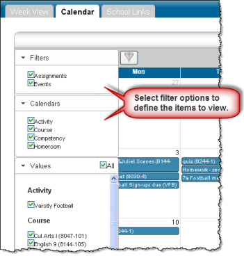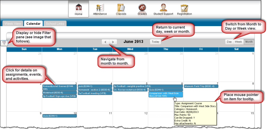 The Calendar page provides a month view of the following information on your student: