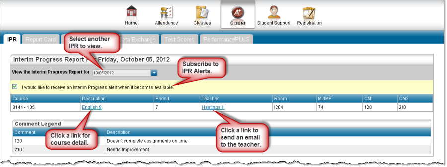 To subscribe to IPR email alerts, check the "Alert me..." box above the course listing. The emails include courses, interim progress marks, teachers' names and comments, and other information from the student's IPR.