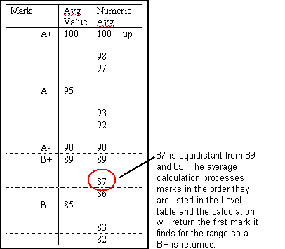 For mark types calculated based on average setups, do not use the raw Gradebook values to calculate averages. In the average setup, do not select the Average Uses Raw Gradebook Values checkbox. Raw gradebook values are on a 100 point scale and it is invalid to combine two different scales to calculate an average. |