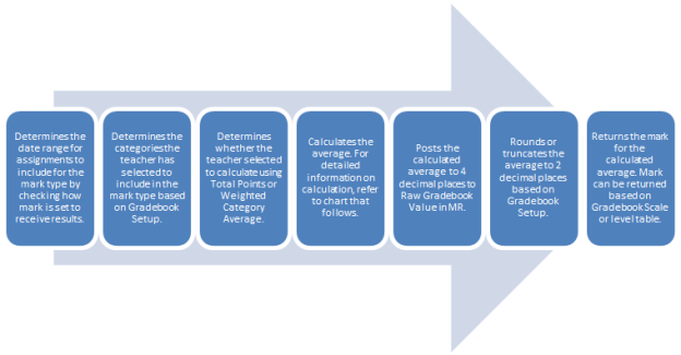Then calculates the marks for any mark type that is defined to receive results from an average setup. In this case, the calculation is calculating the mark based on the marks students receive for other mark types. The calculation selects the average setup to use based on the Master Schedule's Average ID value for the course-section. These mark types are calculated last because the average calculation often includes mark types that receive results from Gradebook based on assignments for a period of time.