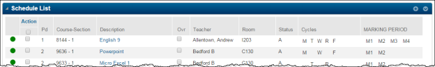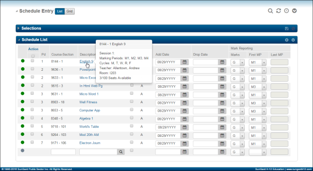 Add and drop courses on the Schedule Entry page. To view the teacher, room, days, or marking periods, move the mouse pointer over the course description. Click the Course Description link to display the Student Course page to resolve a course, change its status, or trail mark reporting information.