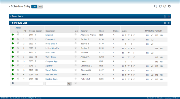 The Schedule Entry page's List mode provides the flexibility for you to personalize it to best fit how you prefer to work with student schedules. On the Selections panel, choose the schedule information to show and select the columns to display. Then click Save on the panel to use these settings every time you use Schedule Entry.