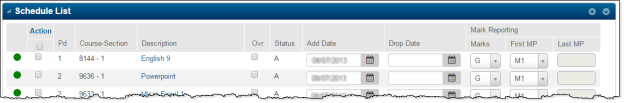 If you make most schedule changes in line within the student's schedule, then use this view. In the Selections panel, select to show the add and drop date fields and the mark reporting options for courses, but not the class details.