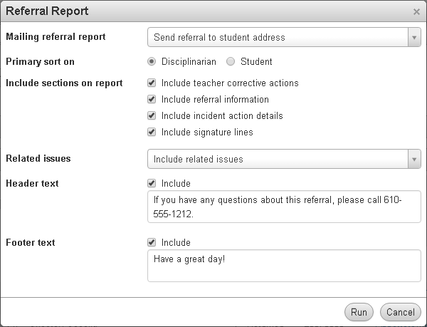 You can print the referral report for a student to print referral information for all incidents created from referrals. The report will include the referral details for all students included in the referrals.