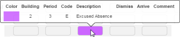 Periods | The attendance periods for the selected date. A background color displays if attendance was entered for a period. To display the color key for a period's attendance code, click To select a period, click on it to display a |