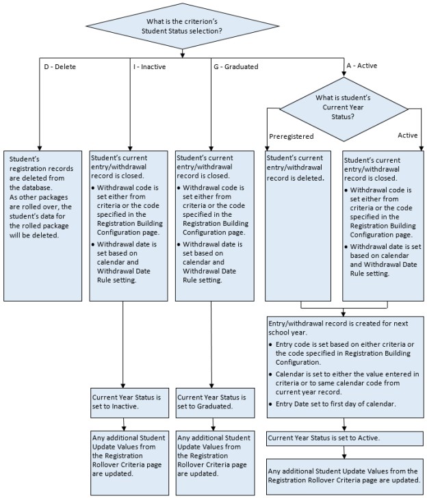 This flow chart illustrates how a single criterion from the Registration Rollover Criteria Page processes student records based on the Student Status the criterion is defined to assign.
