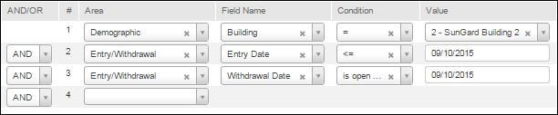 Note: If you search on End Date or Withdrawal Date and use the is open as of condition, you must include the corresponding Start Date or Entry Date field in your search. Otherwise, your results will include students who do not have a record matching your filter.
