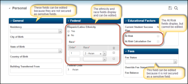 Users who need to view any fields on the Personal page must have at least Read access to the page, but the page resource only grants access to a limited number of non-sensitive fields. To grant access to potentially sensitive information, individual REG PRIVATE resources need to be granted in addition to the page resource. If a user does not have security to view a field, it will not display on the Personal page and the user will not be able to use the field in searches or filters.