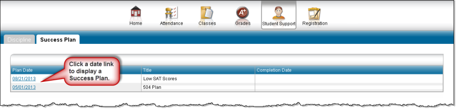 The Success Plan page displays a list of Student Success Plans that have been defined for your student. You can view detailed information for a plan by clicking a date link in the Plan Date column.