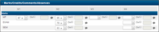 The student was in Algebra 4220-1 for M1 and M2 (Marking Periods 1 and 2). The following are the grades for the course-section, as displayed on the Mark Reporting Detail page (menu path: select Mark Reporting from the main menu, select Entry & Reports submenu, select Student, and then select Report Card Summary. You must click the course link).