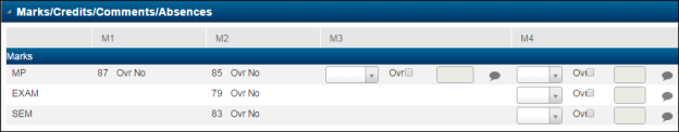The student drops the course at the beginning of M3 to switch to a different course-section. On the Student Course page (menu path: select Scheduling from the main menu, select Student Schedules submenu, select Student, and then select Schedule Entry. You must click the course link). You drop Algebra 4220-1 and set its Last MP field to M2, the last marking period marks were issued.
