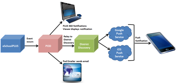 If the subscription options are correctly set up, then the issue could be related to the push service that the eSchoolPlus Family app uses to send the notification from eSchoolPlus to the user's device. The following image illustrates how a notification is sent. In this example, the event that occurs is that the eSchoolPlus task that generates the student alerts is run, and an alert is created for the student.