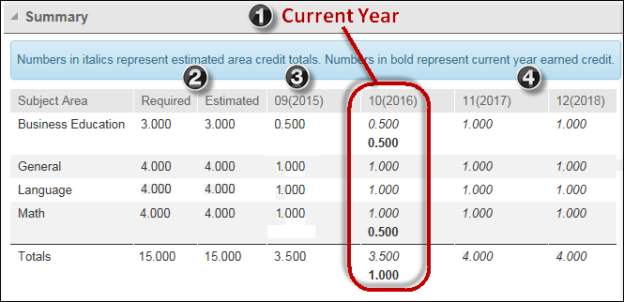 ![]() | The bold numbers in the current year's column represent credits the student has earned so far. The earned credits are available because the student earned credit for classes completed in the first semester. The numbers in regular italics represent the total estimated credits for the year's courses, including both completed and in progress. |