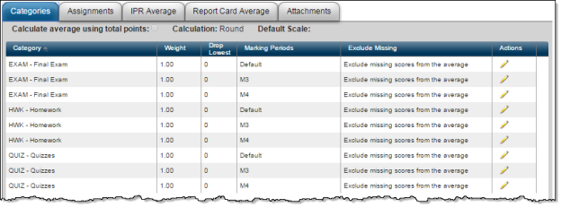 Then the Gradebook Setup page's Categories tab will display like this for a course that meets marking periods 3 and 4: